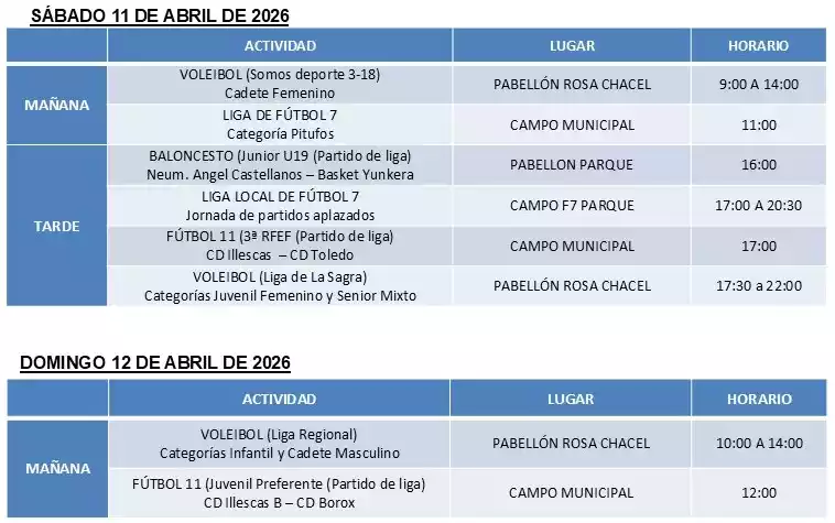 Programacion de actividades deportivas en Illescas dias 18...